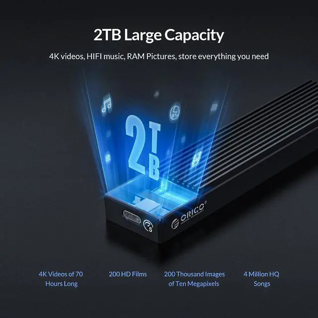 ORICO M2PV-C3 is an M. 2 NVMe SSD hard disk enclosure, using Realtek RTL9210 10Gbps master control solution, supporting UASP acceleration protocol. The external USB 3.1 GEN2 Type-C output interface supports up to 10Gbps transmission rate. Fully compatible Supports four different specifications of M. 2 NVMe SSD solid state drives of 2230, 2242, 2260, 2280, suitable for connecting PCs, smart phones, laptops, smart TVs, smart routers, PS4 and other devices.