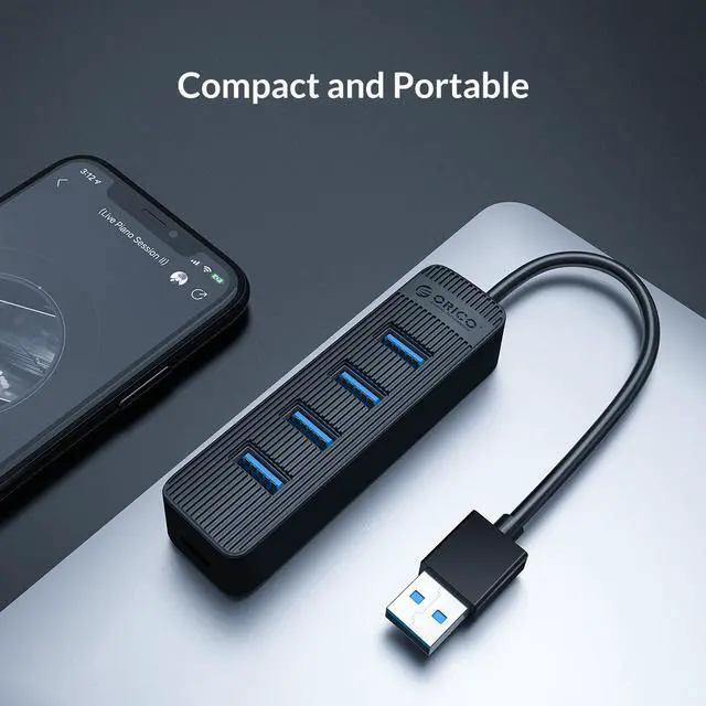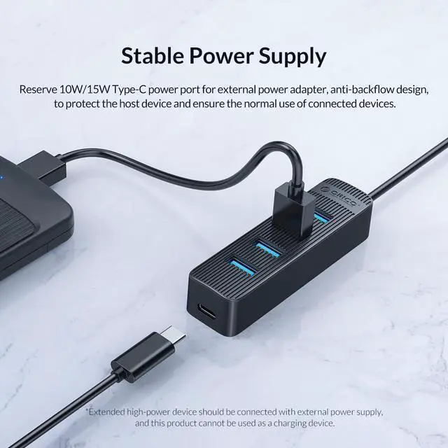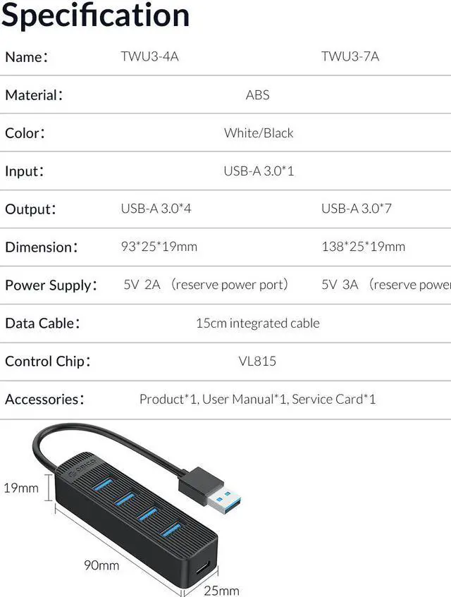 ORICO TWU3-4A is a 4-port USB3.0 hub that can be connected to U disk, mobile hard disk, keyboard and mouse and other devices to meet daily and office data transmission needs.