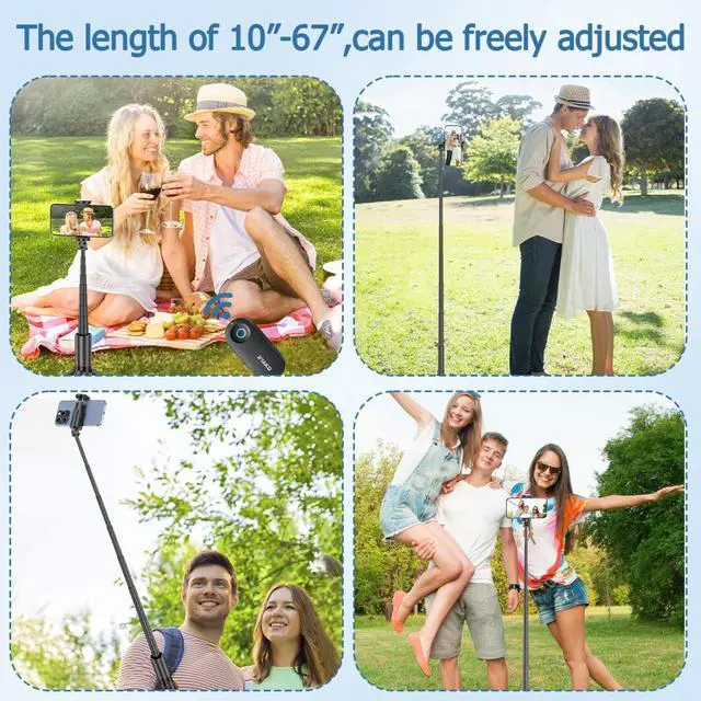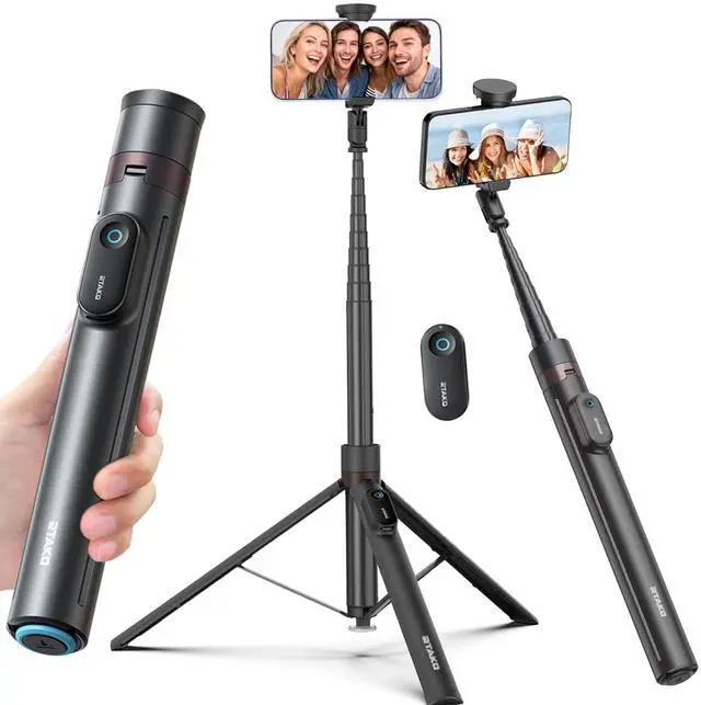 Elevate your photography and content creation with the RTAKO 67 Inch Selfie Stick Tripod. This innovative device features an auto-open tripod stand that deploys instantly, transforming from a compact 10-inch cylinder to a full 67-inch extended height in seconds. The rotatable head design allows for versatile angle capture, with 180° tilt and pan capabilities to achieve perfect framing for any shot. Constructed from durable aluminum alloy with silicone grips, this tripod provides exceptional stability on various surfaces. The included Bluetooth remote connects wirelessly up to 33 feet away and conveniently charges magnetically on the stick itself. Compatible with all smartphones thanks to its adjustable, case-friendly grip, this selfie stick tripod is the ideal companion for travel photography, live streaming, group photos, and video recording. Its collapsible design ensures easy portability wherever your adventures take you.