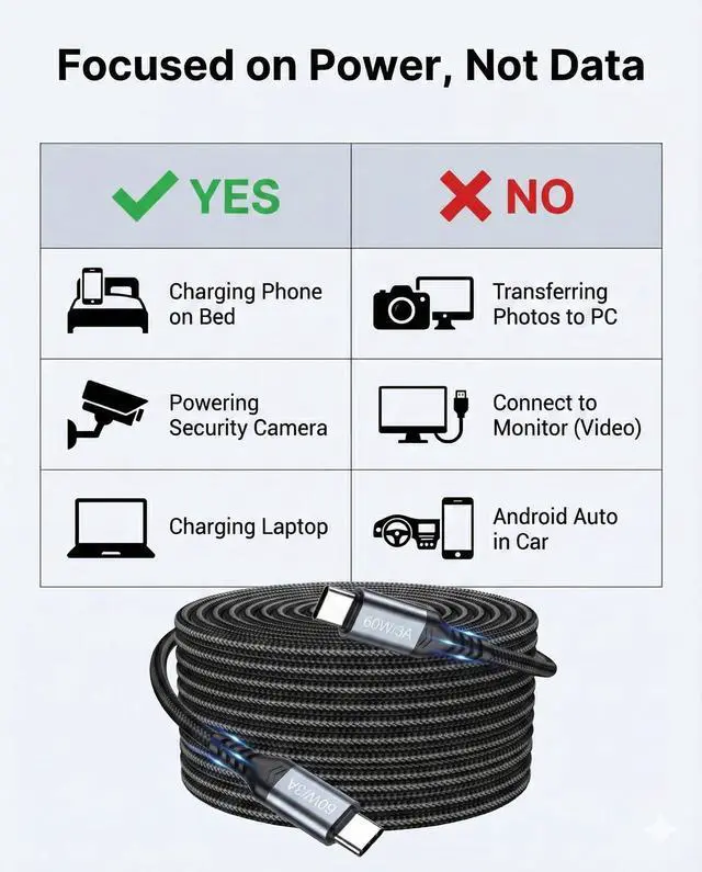 To guarantee stable charging performance over the extra-long 6-meter distance, this cable is engineered as a dedicated power cord.