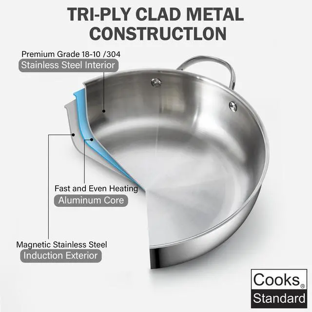 The Multi-Ply Clad Stainless Steel Wok adopts a multi-ply composite structure with stainless steel and aluminum layers, ensuring excellent thermal conductivity and uniform temperature distribution. The 18-10 (Grade 304) stainless steel offers outstanding wear and rust resistance, making it ideal for stir-frying, sautéing, and steaming a variety of dishes.
