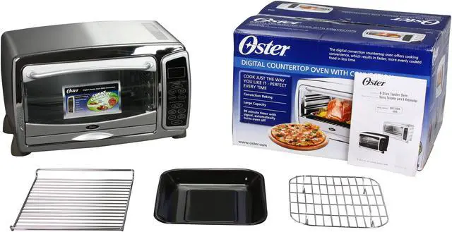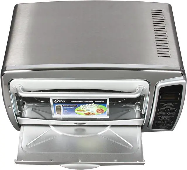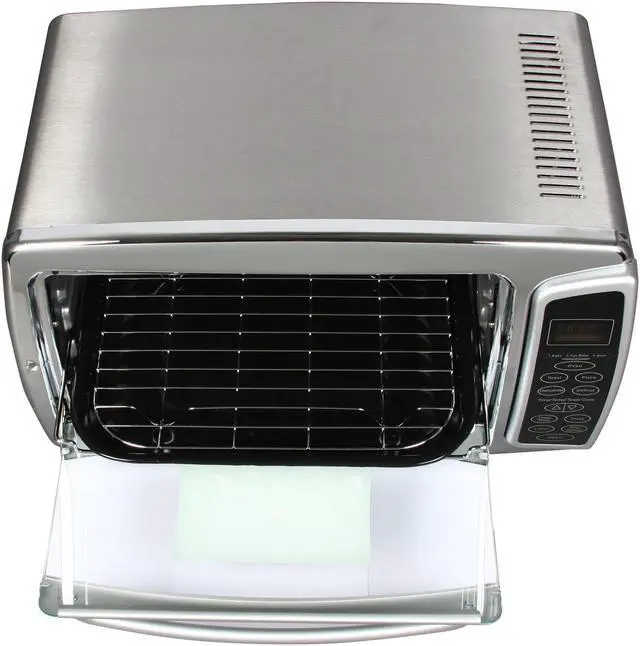 | Features | Extra large capacity Fits 9 by 11 bake ware, whole chicken, roast, small ham, and casserole dish Pizza fit Holds a 12" pizza Convection technology for fast even heating Stainless steal housing with chrome accents is color neutral to white, black, or wood kitchens Bake/convection bake/toast/pizza/and dehydrate functions Easy clean interior for quick clean up Interior light for easy viewing Three rack positions to accomodate a variety of foods 150-450 degree temperature range External removable crumb tray Durable enamel baking pan |