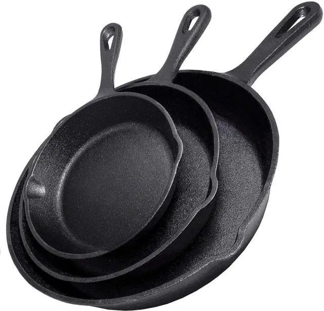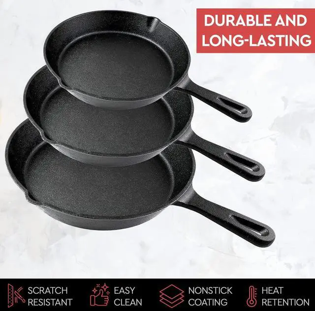 Cast iron skillets are a timeless must-have for every kitchen! The Simple Chef Cast Iron Skillet 3-Piece Set is better than a Lodge Cast Iron Skillet Set - just ask our customers! With this heavy duty and virtually indestructible, so they will last you years, decades, and generations to come! Our skillets are factory pre-seasoned, so they are ready to use straight out of the box. Our cast iron cookware is multi-functional, and suitable for many different cooking methods. Use them on the stovetop, in the oven, over a campfire, and even when slow-cooking! Theyre perfect for frying, sautéing, cooking, grilling, and more. Plus our design has superior heat retention and conducts heat evenly, so your food will turn out great every time!