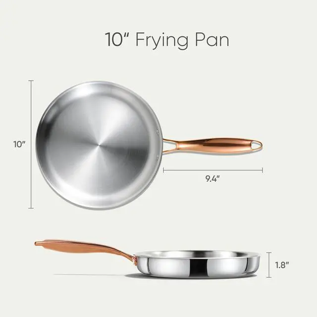 10" Tri-Ply Stainless Steel Frying Pan, Non-Toxic Fry Pan Egg Pan Omelet Pans, Oven Safe, Induction, Ceramic and Gas Cooktops Compatible, Polished Silver