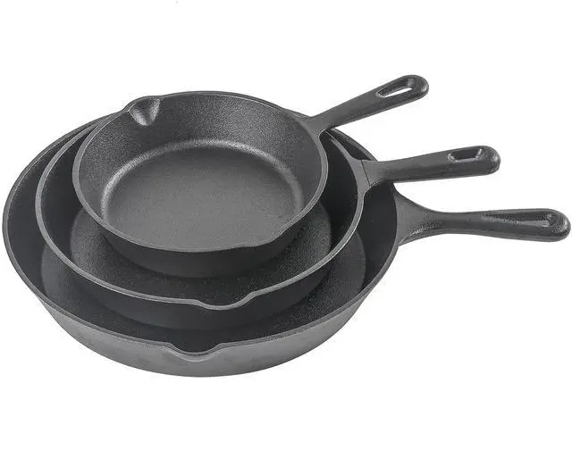 "Enjoy this 3-piece COMMERCIAL CHEF cast iron skillet set for versatile at-home cooking. With excellent heat retention, it delivers mouthwatering results. Ideal for beginners to chefs, cast iron adds nuanced flavor to any dish."?