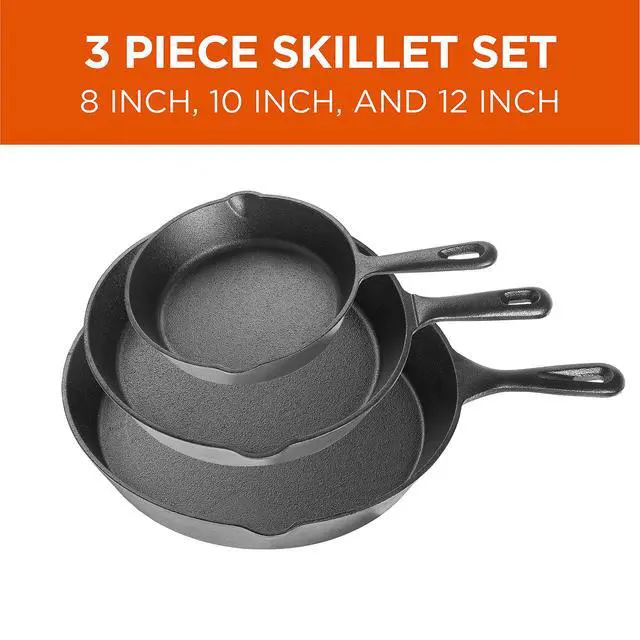 COMMERCIAL CHEF 3-Piece Cast Iron Skillet Set – 8 inch, 10 inch, and 12 inch