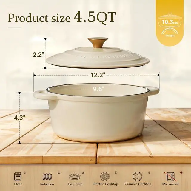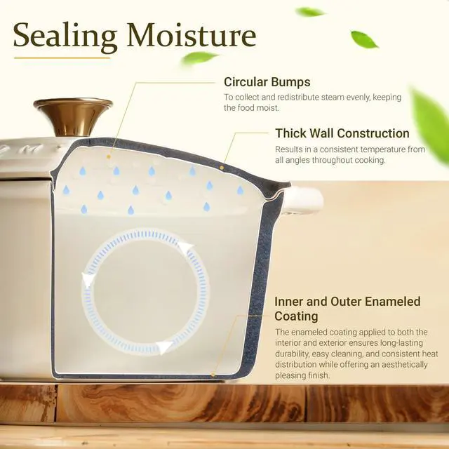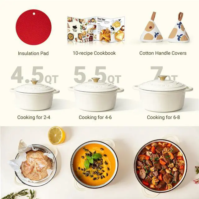 Elevate your cooking experience with Overmont's Premium Enamel Cast Iron Dutch Oven. Crafted for culinary excellence, this versatile cookware is your ticket to culinary perfection. Outstanding Heat Mastery: Our premium enamel cast iron dutch oven excels in heat distribution and retention. Crafted through solid integral molding, it guarantees durability. Perfectly Preserved Flavors: Say goodbye to dry, overcooked meals. Moisture evenly condenses on the lid, preserving ideal humidity and flavors. Unlike conventional pot covers, our lid keeps your dishes succulent and savory. Unmatched Versatility: From stewing to roasting, this all-in-one cookware is your versatile kitchen companion. Unleash your culinary creativity and simplify your kitchen with Overmont. Universal Compatibility: Overmont's premium enamel cast iron dutch oven excels on various stovetops. It's oven safe up to 480, granting you the freedom to explore diverse cooking techniques. Effortless Cleaning & Safety First: The smooth enamel surface ensures easy clean-up. To safeguard your hands, we've included a cotton heat-resistant cap. Package Includes: 1 Overmont Premium Enamel Cast Iron Dutch Oven 1 Cast Iron Product User Manual 1 Set of 10 Delicious Recipes 2 Heat-Resistant Cotton Caps Care & Safety Tips: Gentle Heat: Cooking on medium to low heat is best. High heat is rarely necessary and can lead to sticking and burning. Kind Utensils: Use non-metal utensils to protect the enamel coating. Easy Cleaning: Maintain its glossy finish with a soft sponge or cloth and mild dish soap. Transfer Food: For extended storage, transfer food to another container to preserve flavors. Cool Gradually: Allow it to cool gradually on a heat-resistant surface after cooking to prevent thermal shock. Heat-Resistant Cap: Use the included cap to handle hot handles and lids safely.