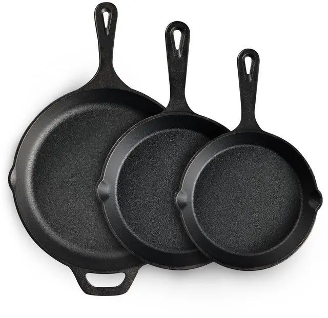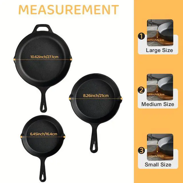 Cast Iron Skillet 3-Piece Set, Heavy-Duty Professional Restaurant Chef Quality Pre-Seasoned Pan Cookware Set, 6", 8", 10" Pans For Frying, Saute, Cooking, Use Indoor/Outdoor, Oven, Grill