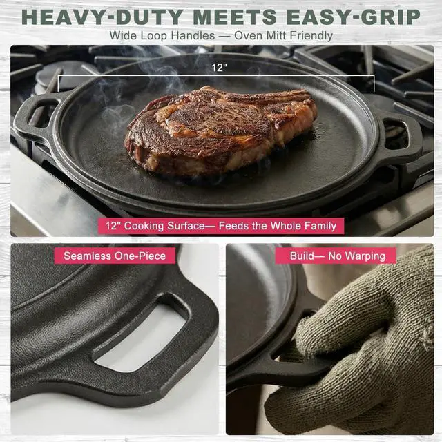 12" Nonstick Comals Para Tortillas -Cast Iron Griddle Pan, Dishwasher Safe Round Skillet with Handles for Stove Top, Oven, Grill & Camping Versatile Flat Top for Pancakes&Meats