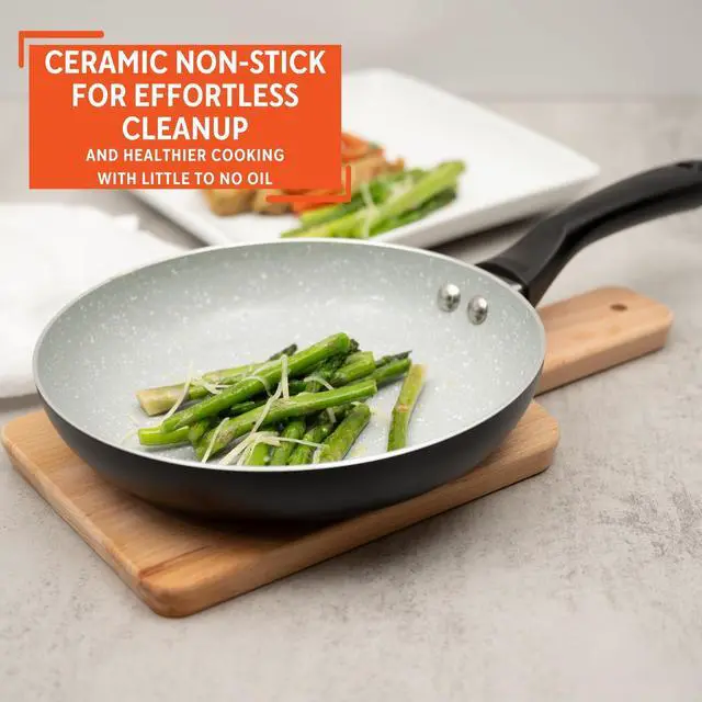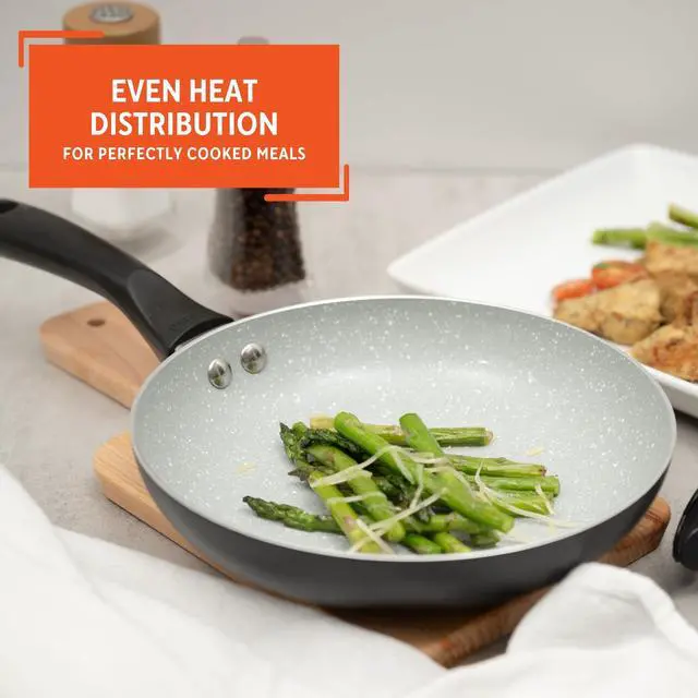 FEATURES COMBINATION: Enjoy the non-stick surface that's PTFE-free, making this pan eco-friendly and scratch-resistant; the cool touch handle provides easy handling during cooking