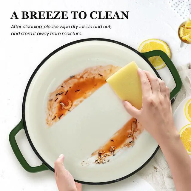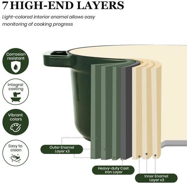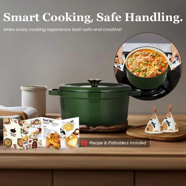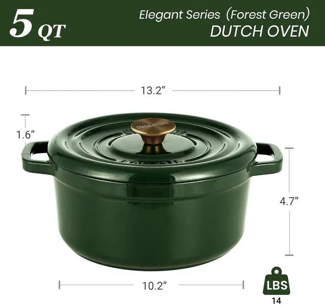 Elevate your culinary skills with the Overmont Enameled Cast Iron Dutch Oven, designed for exceptional heat retention and even distribution. Perfect for slow-cooked meals, stews, and braised dishes, this heavy-duty Dutch oven ensures consistent heat for perfectly cooked, flavorful results every time. Made with a durable three-layer protective enamel coating and a food-safe porcelain glaze, it offers superior resistance to chipping and cracking, ensuring long-lasting reliability. Practical features like widened handles, a heat-resistant stainless steel knob, and a self-basting lid with interior condensation dots enhance both safety and comfort. Versatile and compatible with gas, electric, and induction cooktops, this Dutch oven seamlessly transitions from stovetop to oven, making it an essential tool for any kitchen. A cookbook with 10 classic recipes is also included to inspire your culinary creations.