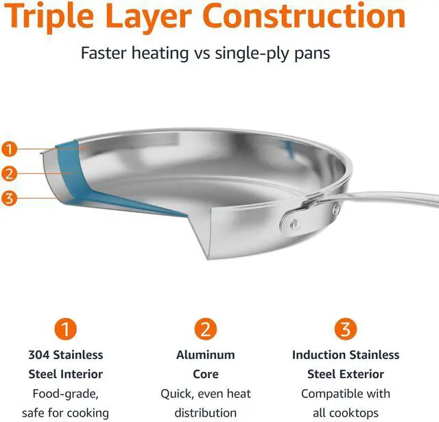 Tri-Ply Construction: 18/8 Stainless-Steel Interior WonT React With Food; Aluminum Core Retains And Evenly Distributes Heat; Polished Stainless-Steel Exterior Provides Strength And Beauty; Consists Of 70% Stainless Steel And 30% Aluminum