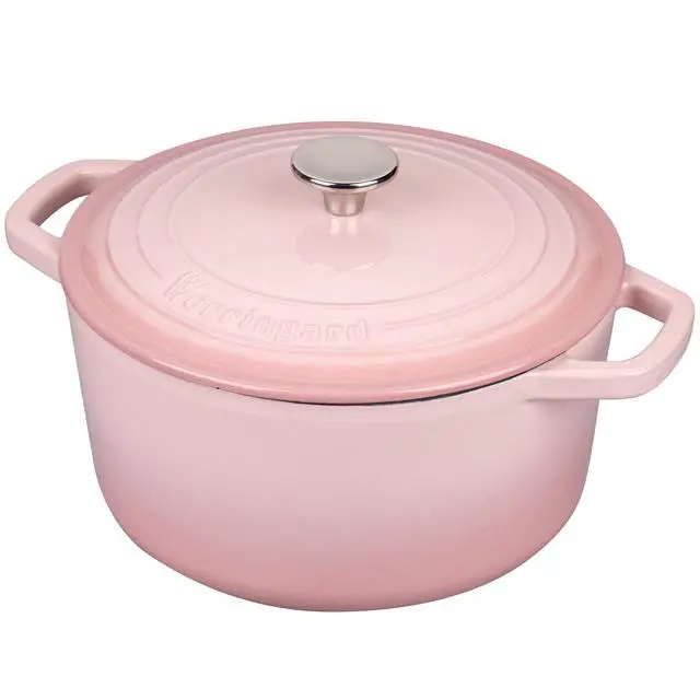 Vorringard is the processional cast iron cookware brand, with top quality material and the most advanced DISA machinery casting production line from Denmark, which can guaranteed our high quality product. Our goal is bring every family affordable cast iron cookware with high quality. The classic design and beauty enamel finish and ergonomic looped handles and snug-fitting lid with a stainless steel knob can meet all your cooking needs whether for processional use or home cooking. Cast iron cookware distributes and retains heat evenly, it is suitable for slow cook, fry, roast, bake and so on. With your proper use and care, our enamel cast iron cookware will last for years with its heirloom durability. How to clean: Wash with a warm soapy water and a nylon scrub brush is recommended, avoid metal utensils; Dry promptly and thoroughly with a lint-free cloth or paper towel, preferably while the cookware is still warm; Hanging or storing in a dry and ventilated environment. Porcelain enamel finish is easy to clean and naturally nonstick.