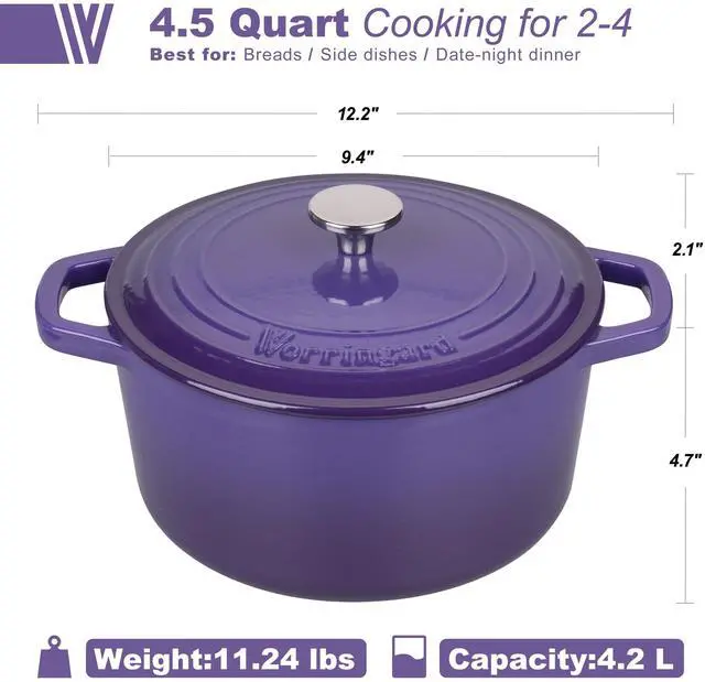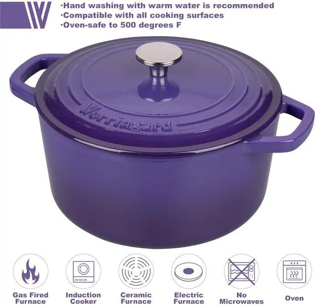 Vorringard is the processional cast iron cookware brand, with top quality material and the most advanced DISA machinery casting production line from Denmark, which can guaranteed our high quality product. Our goal is bring every family affordable cast iron cookware with high quality. The classic design and beauty enamel finish and ergonomic looped handles and snug-fitting lid with a stainless steel knob can meet all your cooking needs whether for processional use or home cooking. Cast iron cookware distributes and retains heat evenly, it is suitable for slow cook, fry, roast, bake and so on. With your proper use and care, our enamel cast iron cookware will last for years with its heirloom durability. How to clean: Wash with a warm soapy water and a nylon scrub brush is recommended, avoid metal utensils; Dry promptly and thoroughly with a lint-free cloth or paper towel, preferably while the cookware is still warm; Hanging or storing in a dry and ventilated environment. Porcelain enamel finish is easy to clean and naturally nonstick.