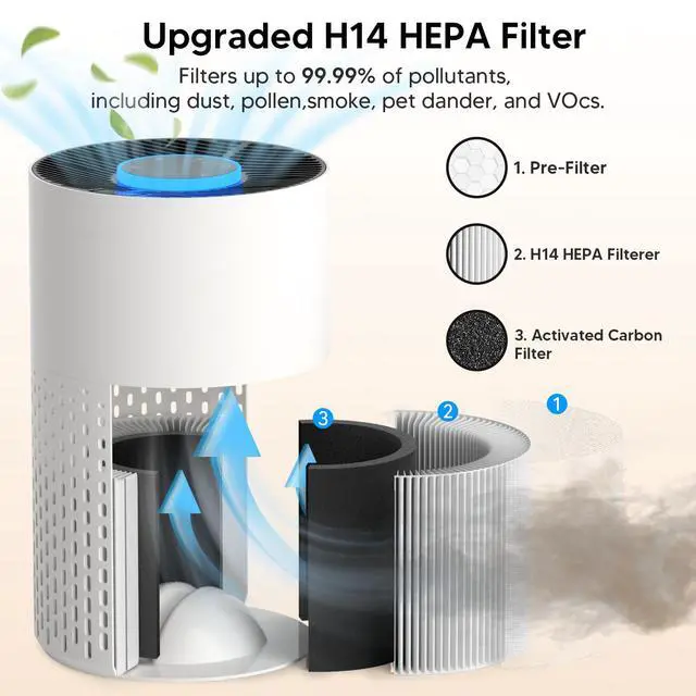 Efficiently H14 HEPA Filtration systemThis 4000B hepa air purifiers for home made of a pre-filter, H14 HEPA filter, and activated carbon,which offers superior filtration capabilities compared to standard HEPA filtersthat filter up to 99.99% of pollutants, including dust, pollen, smoke, pet dander, and VOCs.