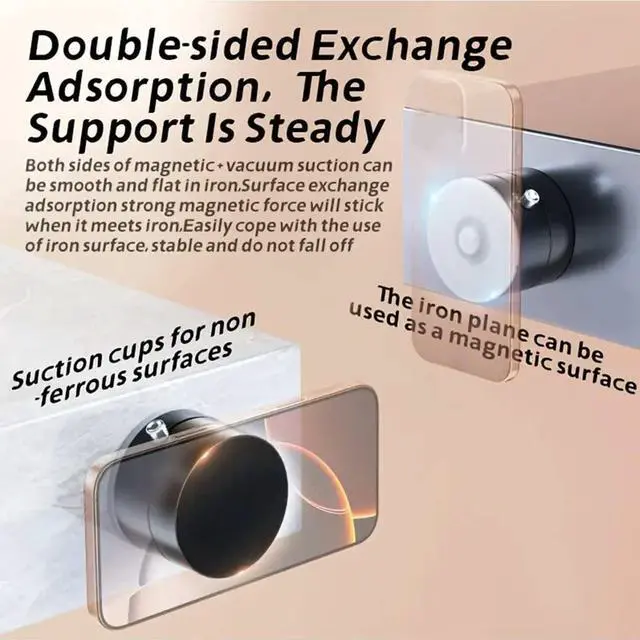 This Foldable Magnetic Vacuum Phone Holder features advanced vacuum suction technology, ensuring a firm, stable grip on various surfaces, including glass, metal, mirrors, and more. The high-elastic base enhances suction power, providing reliable support without leaving any residue. Whether you're using it in the car, gym, or kitchen, this phone holder stays securely in place, even under demanding conditions.