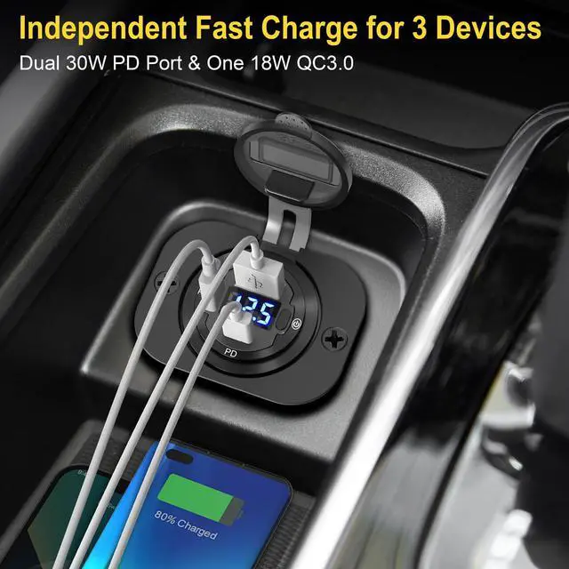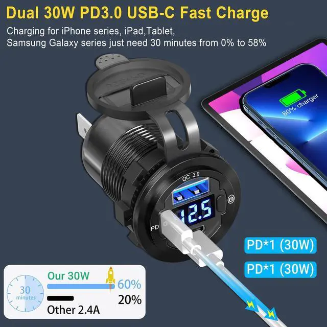 OUFFUN 12 volt usb outlet provide max output 30W for each USB-C port. Charging for iPhone 15/14/13/12/11/Pro Max/X/XR, iPad, AirPods, Tablet, Galaxy S22/S21/S20/S10+ just need 30 minutes from 0% to 65%. PD3.0 is compatible with QC4.0, QC3.0 and QC2.0 of Qualcomm.