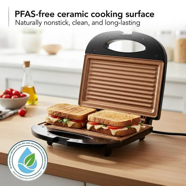 Designed for seamless cooking, the non-stick coated plates prevent food from sticking and make cleaning fast and easy.