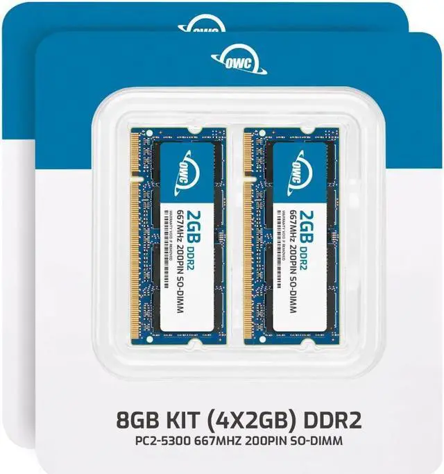 • OWC 8GB UPGRADE: Consists of 4pcs of 2GB DDR2 667 PC2-5300 CL5 2Rx8 200-pin 1.8V SODIMM Memory RAM Module Upgrade Kit for Select Laptops or All-in-One Systems.