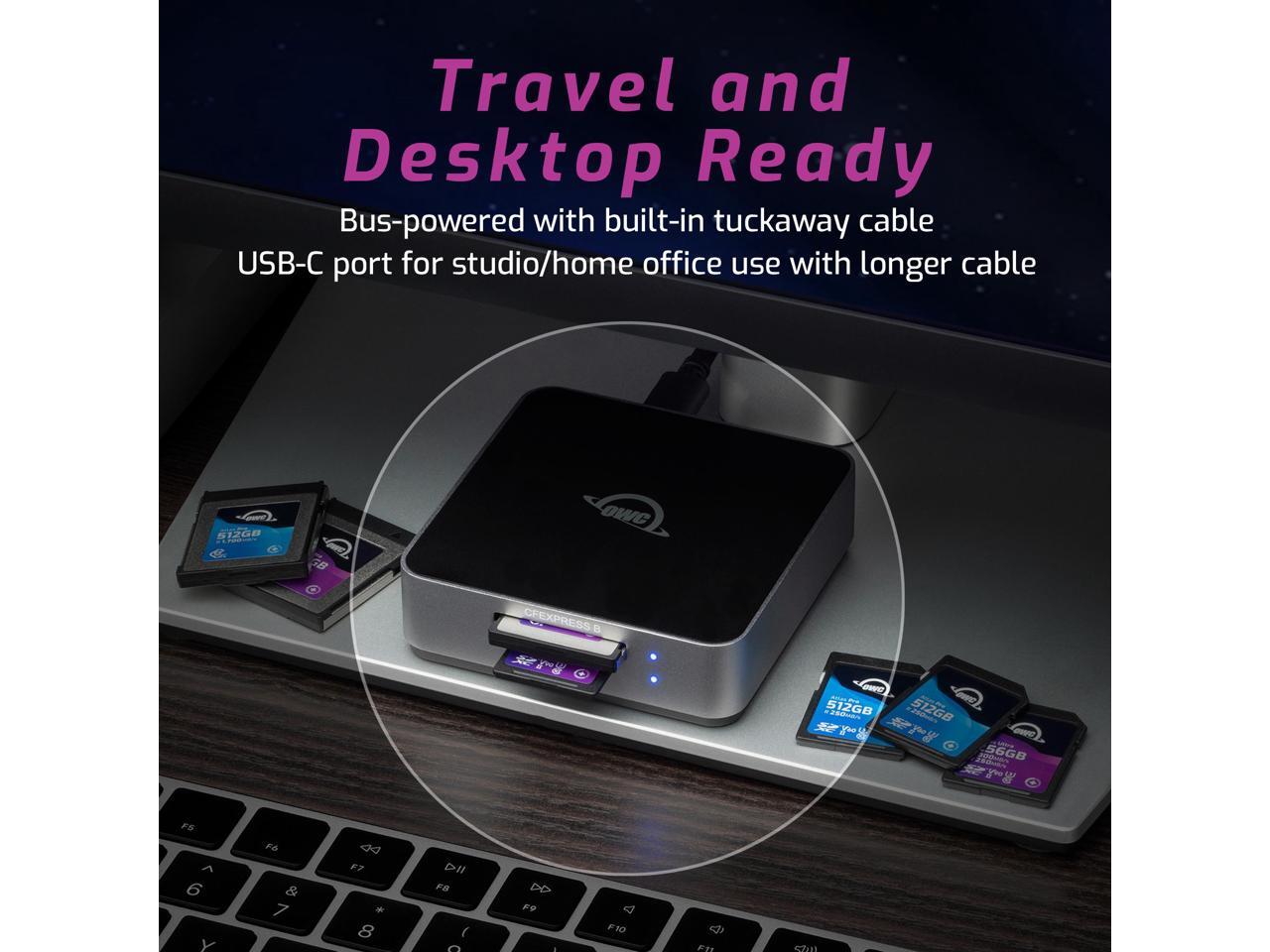 - DESKTOP-READY: Second USB-C port for longer cable use at studio/home office with built-in protection; STABLE: Non-skid rubber feet keep reader in place with OWC ClingOn support to secure your USB-C cable