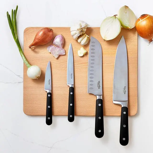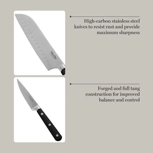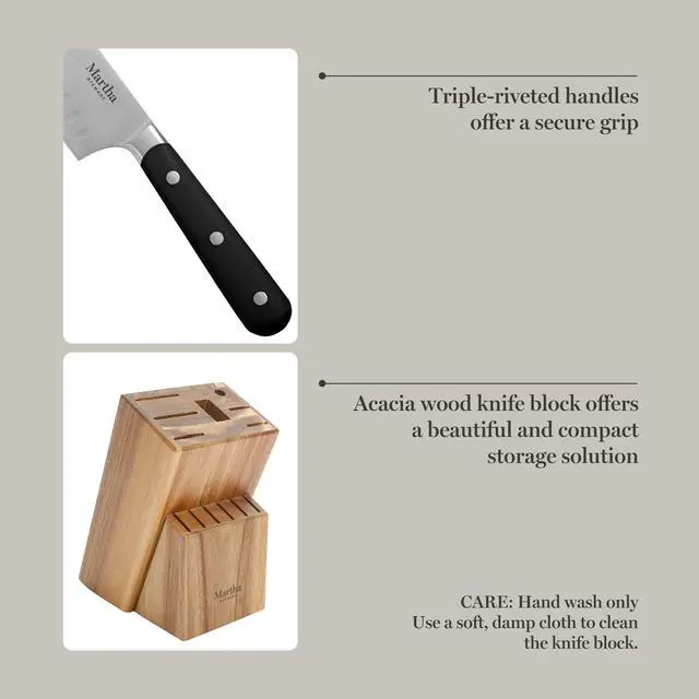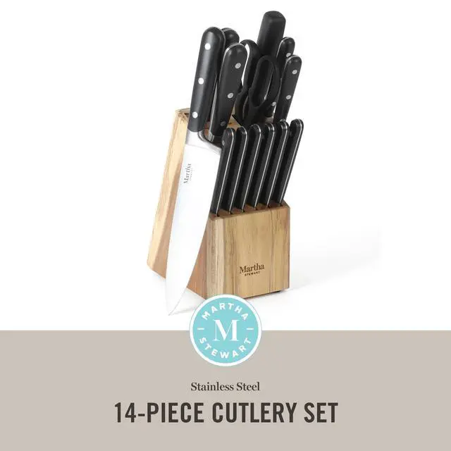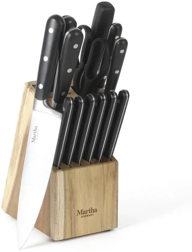 Cut and chop with confidence and take the guesswork out of everyday food prep. The Eastwalk 14-piece Stainless Steel Knife Set from Martha Stewart offers all the essential tools for both amateur and experienced home cooks. Made from forged stainless steel with full tang construction, each high-carbon blade provides maximum sharpness and alignment to cut, chop, julienne, slice, dice and more with ease and precision. The ABS triple-riveted handles promote strength and balance and ensure a safe and comfortable, ergonomic grip. Store the knives in the beautiful acacia wood knife block when not in use. Hand wash only. To clean the acacia wood block, wipe with a soft, damp cloth.