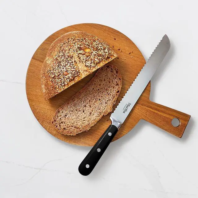 | Included Components | One 8-inch chefs knife, one 7-inch santoku knife, one 8-inch bread knife, one 5-inch utility knife, one 3.5-inch paring knife, six 4.5-inch steak knives, one pair of kitchen shears, one sharpening steel, and one acacia wood block |