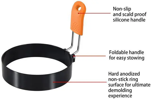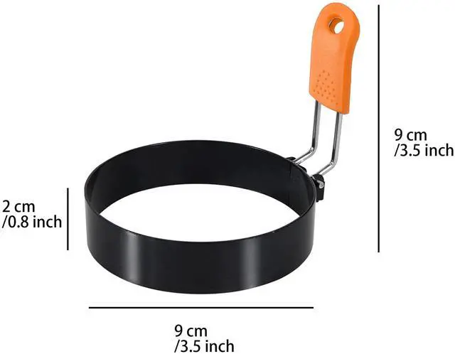 Leak-Free Perfect Egg Circles for Cooking: Solidly designed to sit sturdily in your frying pan or on your griddle for perfectly round eggs youll be proud to place on top of your burgers./br/br Heat Isolated Handles: The round egg cooker ring is featured with silicone heat isolated handle and designed to keep high temperature out of your touch./br/br Premium Stainless Steel: Our egg rings are made from durable BPA free non-stick stainless steel. Dishwasher safe./br/br Multi-functional Tools: Ideal for hamburgers, breads, frying or poaching eggs, Omelets and pancakes. More than enough for adding other toppings such as veggies, cheese, ham and bacon. Possibilities upon your imagination!/br/br Medium Size Rings: These stainless steel egg rings for frying eggs are 3.5 inch in diameter and 0.8 inch depth, which is the size for professional and commercial chef. Now you can enjoy your home made Mc Muffins at your kitchen.