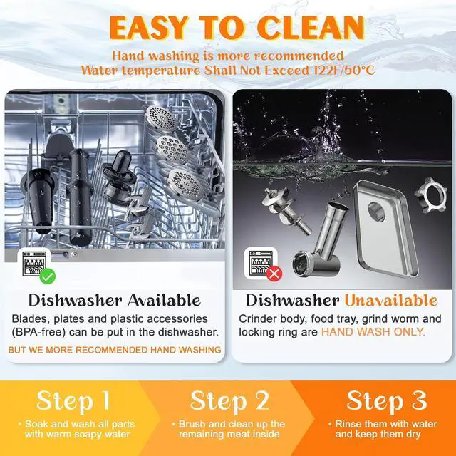 | Included Components | 2 Stainless Steel Blades & 3 Stainless Steel Cutting Plates, 3 Shredder Slicer Blades, 2 Meat Claws, Burger Press, Food Pusher, Machine Body, Sausage Tube & Kibbe Set |