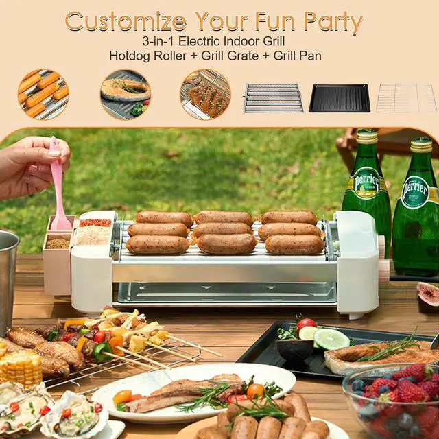 Electric Hot Dog Roller 6 Rollers - 3 in 1 Indoor Grills Portable with Non-stick & Smokeless Removable Grill & BBQ Griddle Plate, Stainless Sausage Grill Cooker Machine, for Family party Use