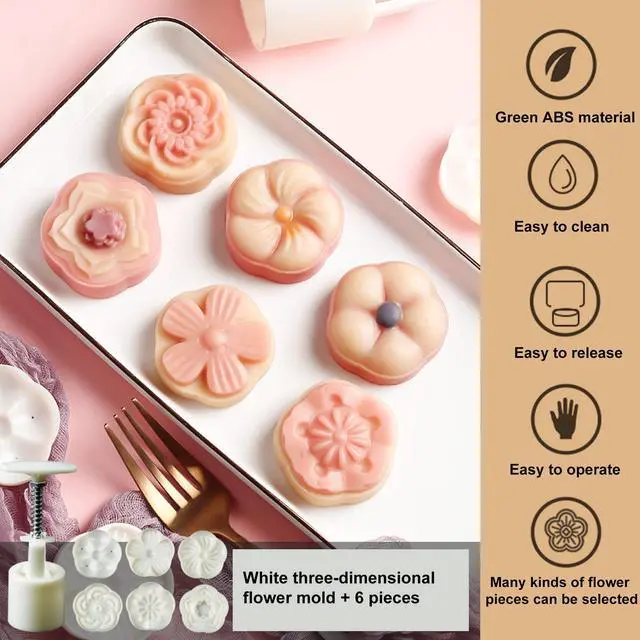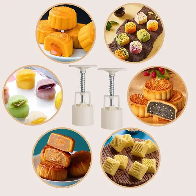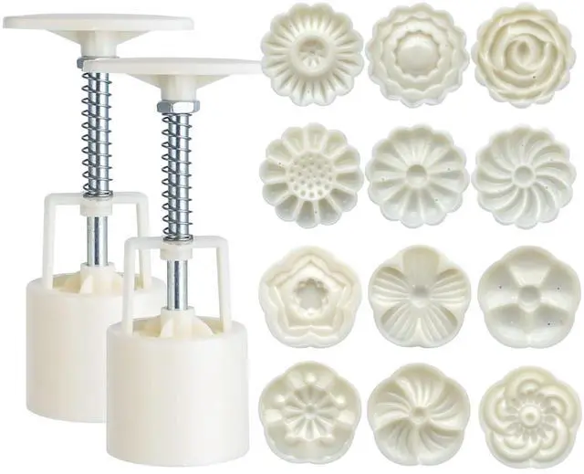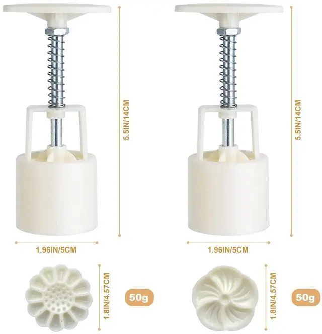 Moon Cake Mold Set Name: 50g Round Moon Cake Mold Set Material: ABS Color: White Size: height of bucket: 5.5 inch / bottom: 1.96 inch / diameter of Stamps: 1.8 inch Package Included: 2 * mooncake mold / 12 * stamps,14 pieces in total. This molds product not only can make the chinese traditional festival moon cake, but also can make dessert. Especially for those who love DIY cookies. Easy to use and the imprint is very good. The mold is able to release it just fine. Clean up is also easy. Fun with you family! Unique design! Nice and simple! you will love this little cookie/cake molding device!