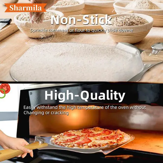 Easy to Use Made with high-quality aluminumand can easily withstand the full weight of your pizza without deformation. With a smooth surface and a sprinkle of cornmeal, our pizza pie will effortlessly glide off the peel and into the pizza oven.