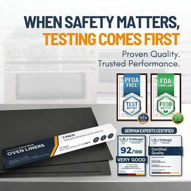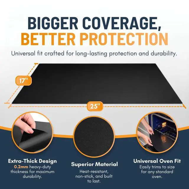 SUPERIOR QUALITY: Withstands up to 500°F and is 100% BPA Free and PFOA Free. Each oven floor protector liner is made from a durable, heat-resistant coating, reinforced with fiberglass fabric. Each pack comes with 2 oven liners measuring 17 by 25, with a thickness of 0.2mm, providing you with an extra-thick durable product that covers your entire bottom oven. Easily cut to size using scissors to fit your oven