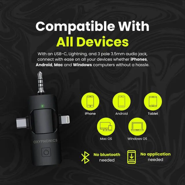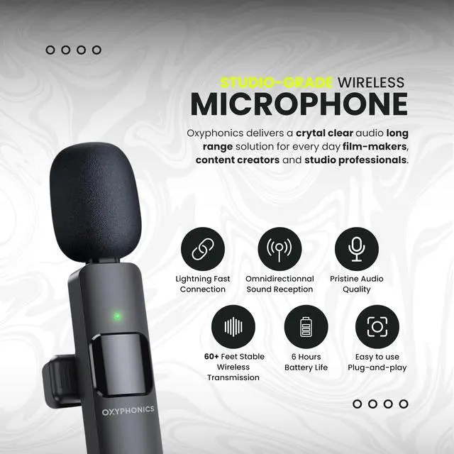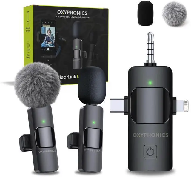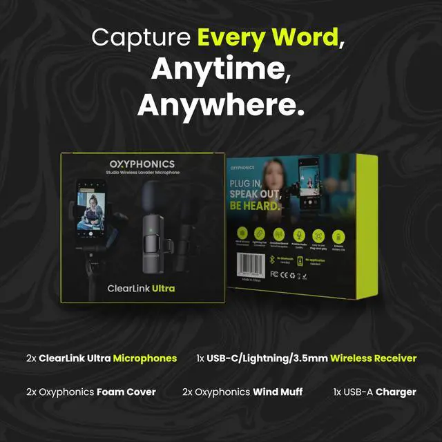 | Included Components | 1x Oxyphonics Receiver for iPhone, iPad, Android, Mac, PC, Camera, 1x USB-A to USB-C Connector, 1x User Manual, 2x ClearLink Ultra Lavalier Microphone |