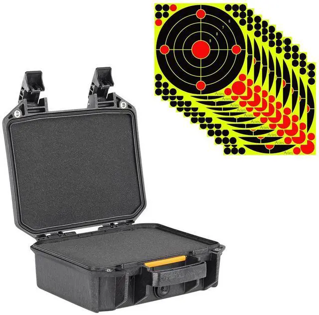 The interior is lined with customizable foam, allowing you to securely fit your pistol and accessories, minimizing movement during transport. The case's sturdy latches and reinforced hinges add an extra layer of security, ensuring that your firearm remains safe and intact. In addition to the superior protection offered by the Pelican V100 Vault Small Pistol Case, this bundle includes a 10-pack of 12x12" Splatter Shooting Target Stickers. These targets are perfect for enhancing your shooting practice, providing clear visibility of your shots with their splatter design. Whether you're at the range or in the field, this comprehensive bundle equips you with the essentials for both storage and practice.