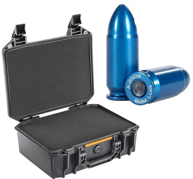 • INCLUDED - Pelican V200 Vault Medium Handgun Case with Foam (Black), 10x Lyman A-Zoom Snap Cap for 9mm Luger. Enjoy peace of mind with added protection for your firearm and reliable dry-fire practice.