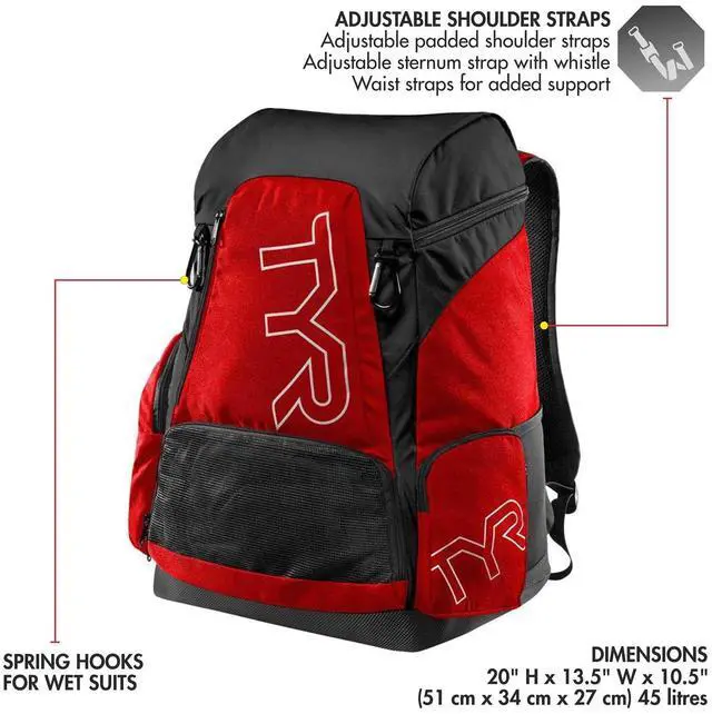A new twist on an old classic, the TYR Alliance gym bag is packed with state-of-the-art features engineered for athletes on the go. With a cutting-edge, space saving design, the 45L capacity maximizes storage without the bulk. In addition to contour-shaped padding for ideal ergonomics and lumbar comfort, the new design also includes multiple front and side pockets, expandable mesh pockets for separating wet and dry items, spring hooks for wet suits, a mesh water bottle pocket, adjustable straps, and a protective storage space for large electronics.