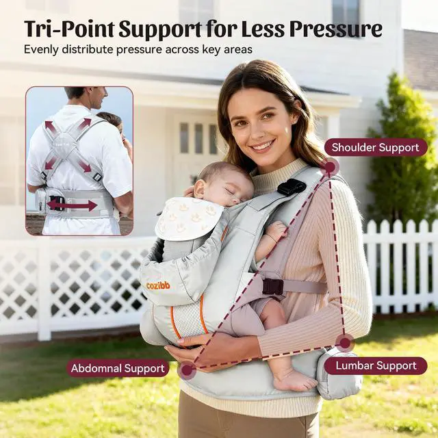 • [Ergonomic Tri-Point Support]- The toddler carrier features an innovative 360°air-cushioned waist belt (waist size 27-38) with a 4.72 wide double-sided hook-and-loop strap. Its ergonomic three-point support technology evenly distributes weight across shoulders and hips, effectively alleviating discomfort. This makes it especially suitable for mothers recovering from C-sections, ensuring comfort during extended wear.