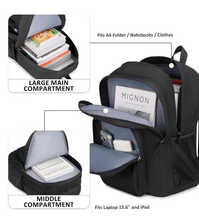 Dual Main CompartmentsDesigned with two independent main compartments for better organization. The large pocket holds bulky items like textbooks and clothing, while the slim compartment doubles as a laptop sleeve for most 15.6-inch devices, offering secure protection without an extra bag.