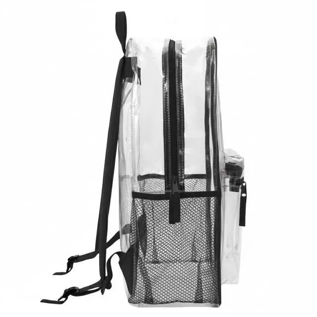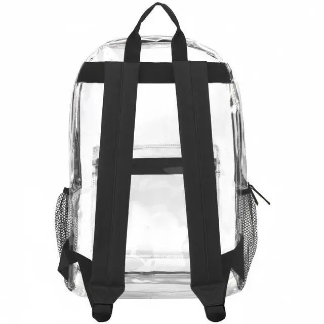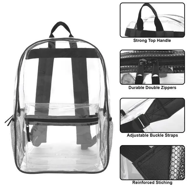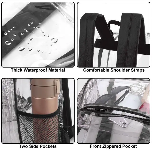 Each see through backpack has 2 side pockets, waterproof outer shell, adjustable, roomy front zippered pocket, and padded back straps for comfort.