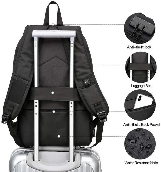 - A luggage sleeve allows business backpack fit on luggage/suitcase, slide over the luggage upright handle tube for easier transport. Also fit under the seat.