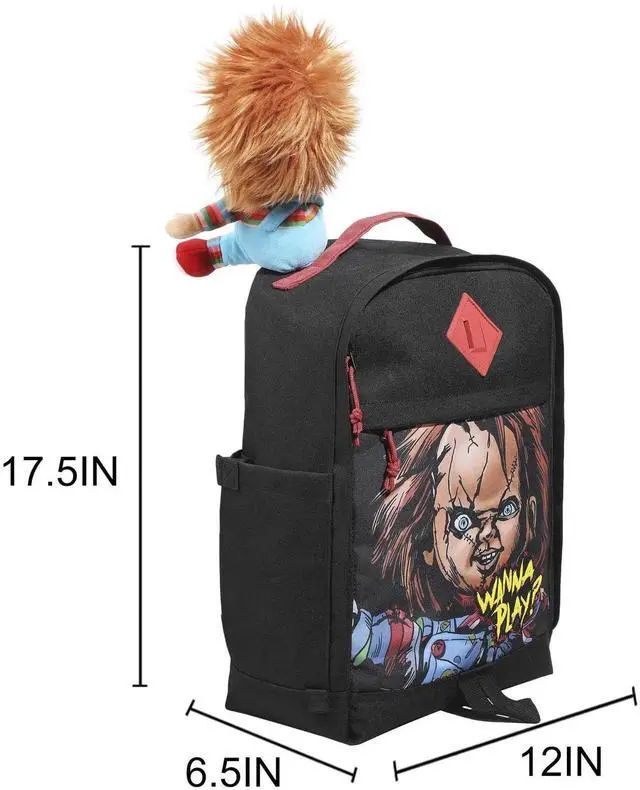 Show off your love for the horror classic with this black Chucky backpack. Featuring bold character art of Chucky on the front and a plush Chucky charm, this bag is both creepy and cool. It includes a front zipper pocket for easy access to essentials, an interior laptop sleeve for your devices, and a carabiner patch for added functionality. Made with durable poly and PU materials, it measures 12" W x 17.5" H x 6.5" D and can be wiped clean for hassle-free care.