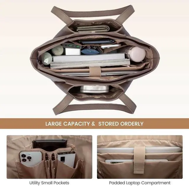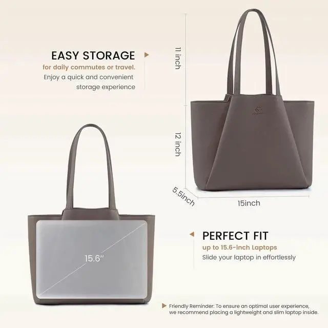 Spacious & Practical Design Measuring 15 x 5.5 x 12 inches, this womens tote bag features a roomy main compartment, a padded 15.6-inch laptop pocket, two slip pockets, and a zippered pocket. Its perfect for iPad, papers, files, headphones, and more, ensuring your essentials are organized and accessible.