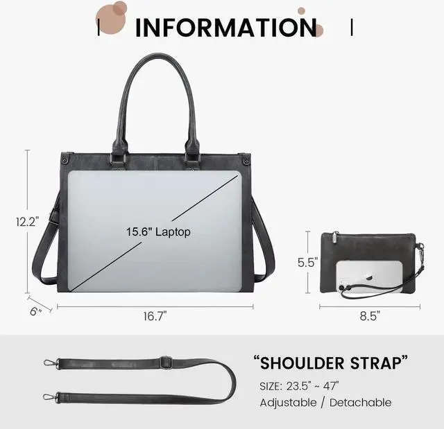 Large Capacity Laptop Tote Bag: This laptop bag for women is 16.7" x 6" x 12.2" and weighs 3 lbs, designed for laptops up to 15.6 inches. It has dedicated laptop and tablet compartments with premium padding for protection. With 12 compartments and pockets, including anti-theft and pen slots, it ensures organized storage. The included clutch purse can be used separately or within the main bag, perfect for storing your phone, keys, cards, and makeupan all-in-one bag.