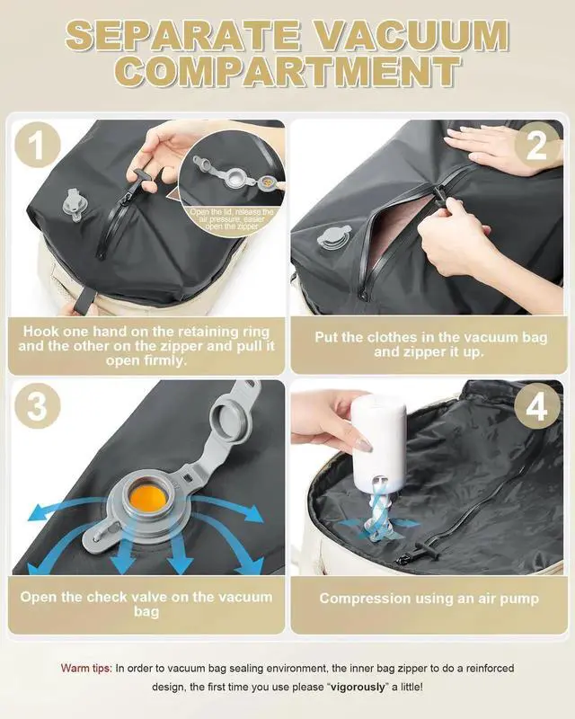 Vacuum Compression Bag and Air Pump There is a vacuum compression bag inside the largest compartment of the backpack, you can put the clothes into the vacuum bag, tighten the zipper, open the one-way exhaust valve, and use the air pump for vacuum compression to reduce the volume of the items occupying the volume, and load more things. Please note that the zipper used in the vacuum bag requires more force to pull, this is to ensure that the vacuum airtight, not the zipper damage is not smooth.
