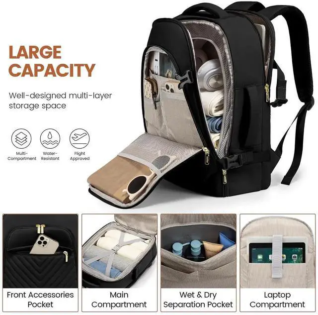 LOVEVOOK 40L Travel Backpack for Women & Men, Carry on Backpack for Airplanes, TSA Personal Item Travel Bag fits 17" Laptop, Waterproof Travel Essentials Flight Approved with 2 Packing Cubes, Black
