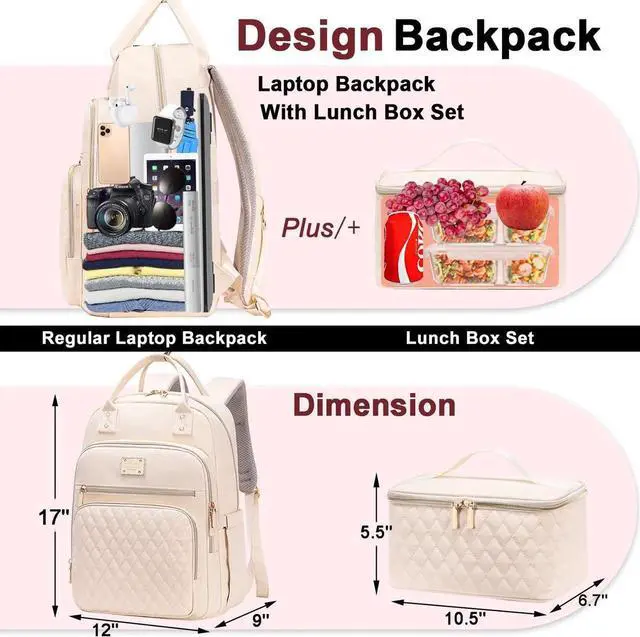 Laptop Backpack with Lunch BoxThe Work Backpack With Lunch Box Set,Making It Convenient For Daily Use. The Dimensions Of The Work Backpack Are L12 * W9 * H17, While The Lunch Bag Measures L10.5 * W6.7 * H5.5. This 2-In-1 Computer Backpack For Women Allows You To Use It As A Lunch Backpack For Women When Carrying The Lunch Box, Or As A Nurse Backpack For Everyday Needs.
