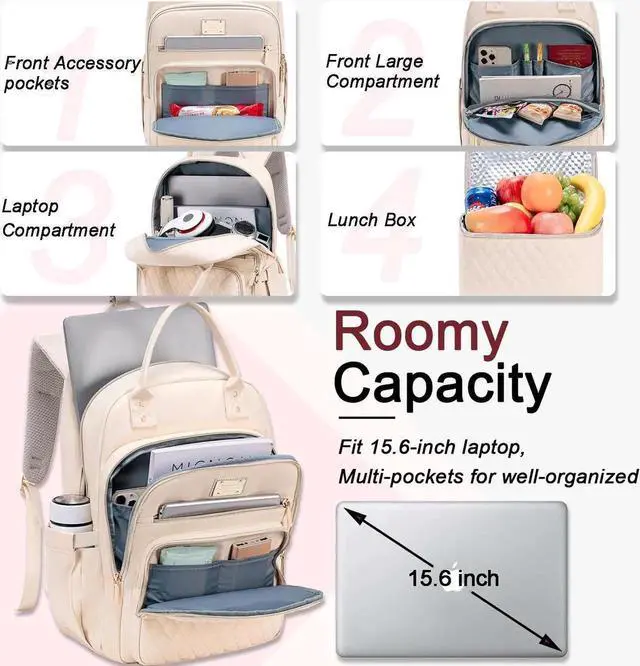 Lunch Backpack with Multiple PocketsNurse Insulated Backpack For Women, Lunchbox Backpack For Women Features Multiple Compartments, Including A Laptop Sleeve Compartment That Can Protect A 15.6 Inch Laptop And Accommodate A Tablet. Has 11 Inner Pockets And 2 Side Pockets For Bottles, Umbrellas, Textbooks, A4 Folders, Wallets, Clothes, Sunglasses, And More. The Front Pocket With Mesh Pockets Can Hold Your Phone, Charger, Cards, And Other Small Items.