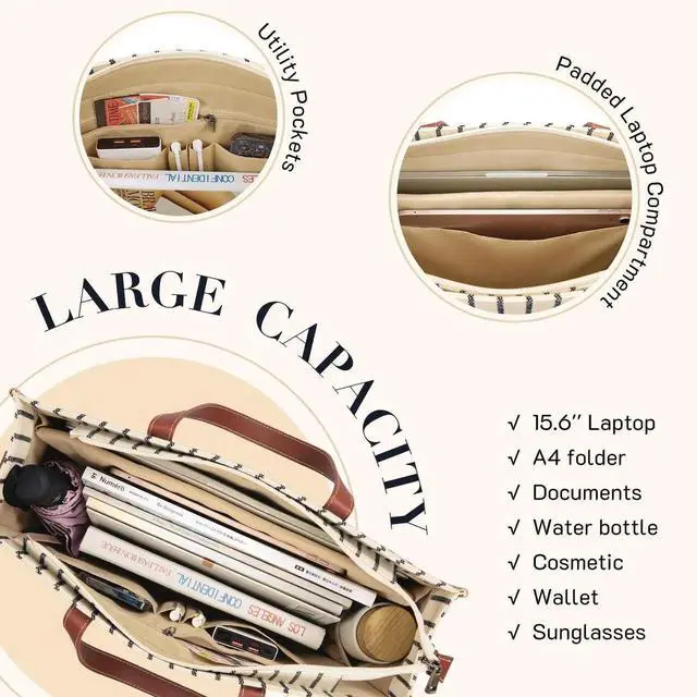 Large Capacity Laptop Bag: 15.9 L x 11.7 H x 5.1 W, zip-top closure for security, a large main compartment fits for an A4 binder, a separate padded laptop compartment to protect your laptop up to 15.6'', and a tablet slot for 10.9'' iPad