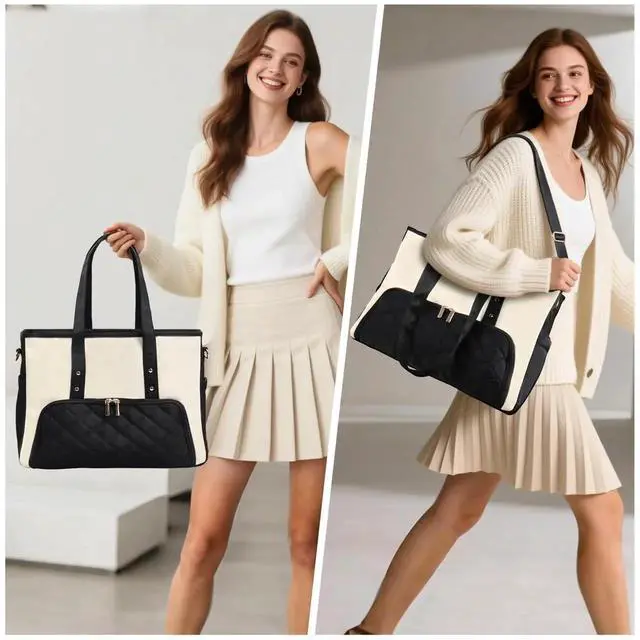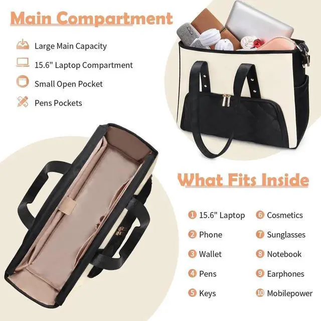 Insulated Cooler Compartment: Will you need to pack your lunch in your work bag? This laptop tote bag for women included leakproof lunch compartment which keeps foods warm and keeps drinks cold and easy to clean. Measuring 15.35''x5.12''x6.3''(L*W*H) , the lunch bag offers a 7.5L storage capacity, it can fit up to 10 cans of drinks or ONE MEAL-2 x small food containers plus some snacks.