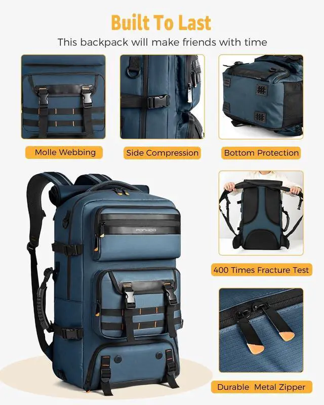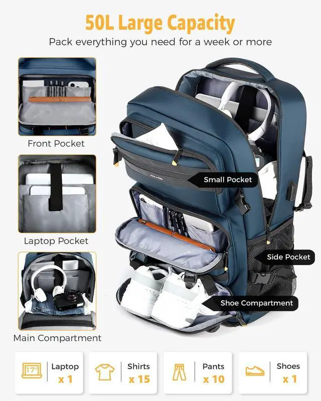 50L LARGE CAPACITY: This travel backpack has 10 pockets, including a quick-access front pocket, a waist anti-theft pocket, a water bottle pocket, a separate shoe pocket, and a compartment for a 17.3-inch computer and tablet. The items can be stored in an orderly and safe manner, so that it is an ideal for long-distance travel for 5-7 days